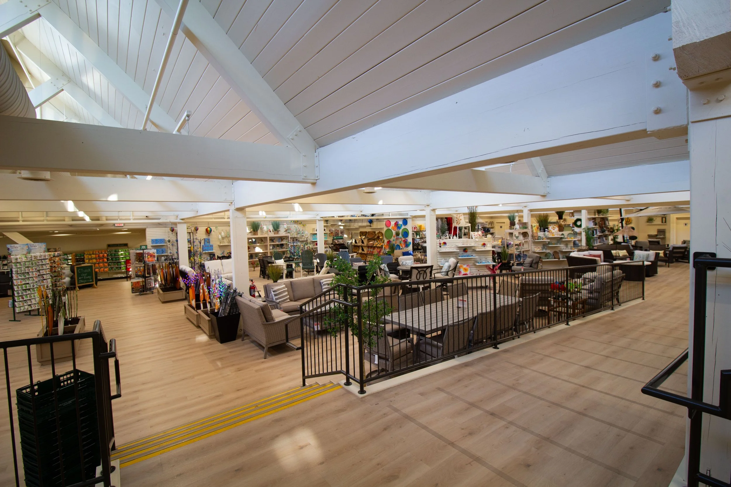 The building’s stepped floor levels followed the natural slope of the site, creating additional complexity for retail flow. The owners envisioned a signature store that would preserve the building’s distinctive architecture while providing a seamless customer experience connected to large greenhouse shopping areas.